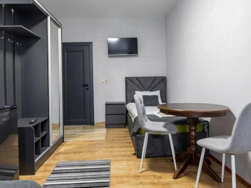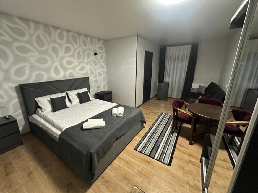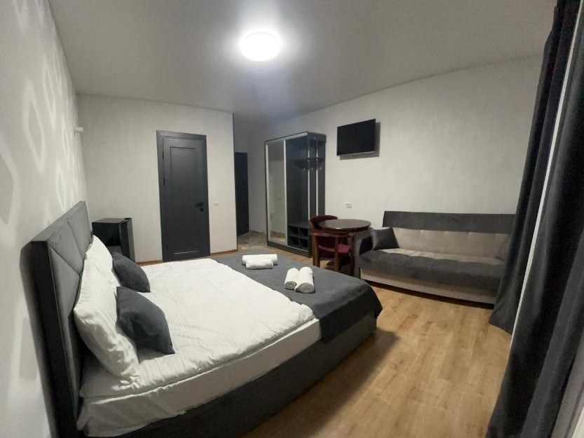 Однокомнатный номер создан для полноценного отдыха гостей. В номер есть двуспальная кровать, шкаф для вещей, телевизор, прикроватные тумбы. В ванной комнате есть душевой кабиной, комплектом полотенец.
