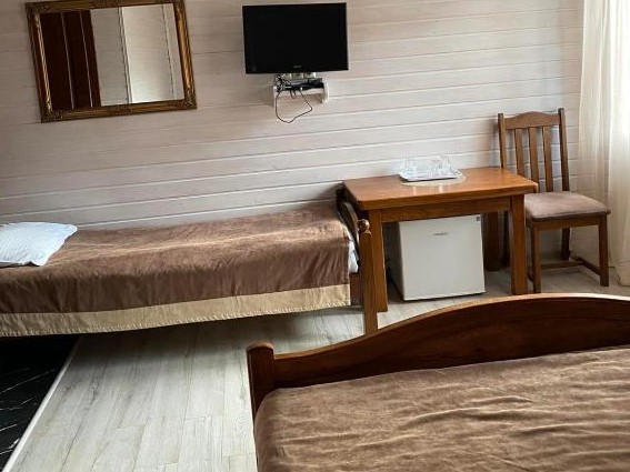 Стандарт трехместныйОднокомнатный номер общей площадью 20 кв.м. рассчитан на проживания трех персон. Номер оборудован двухспальной кроватью и одной односпальной, прикроватными тумбами, телевизором со спутниковым ТВ, столом со стульями. В номере есть выход на балкон. Санузел оснащен душевой кабинкой с круглосуточной подачей холодной и горячей воды, косметическим набором, комплектом полотенец. | Даты проживания | Тип питания | Количество человек | Цена за сутки |
