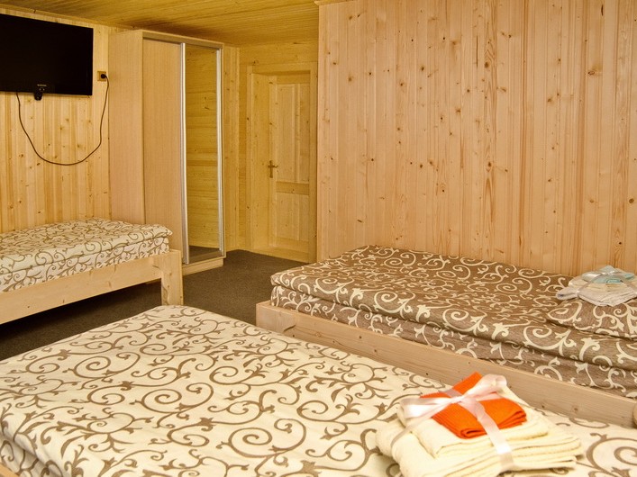 Просторный однокомнатный номер может комфортно разместить до 5 человек. В номере расположены односпальные кровати, телевизор, шкаф для вещей, прикроватные тумбочки. Ванная комната оснащена душевой кабиной, комплектом полотенец.
