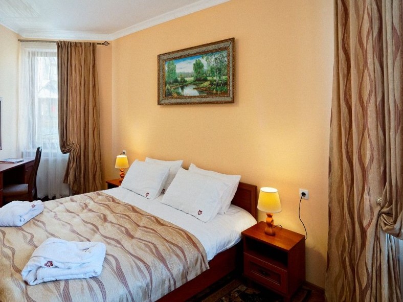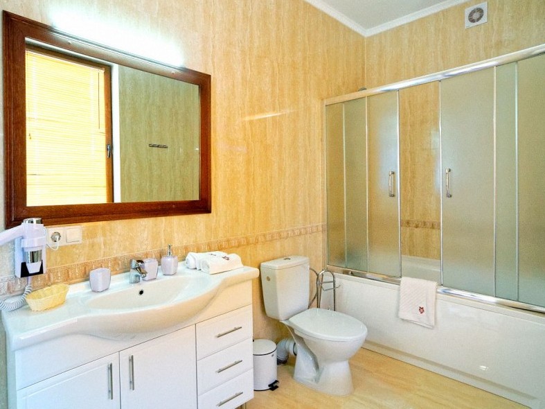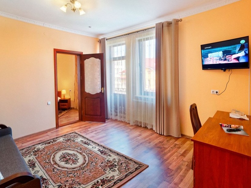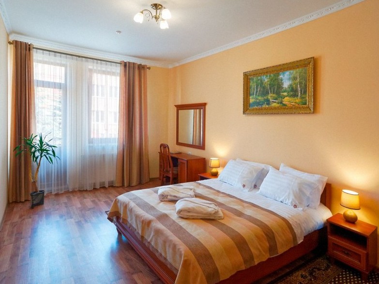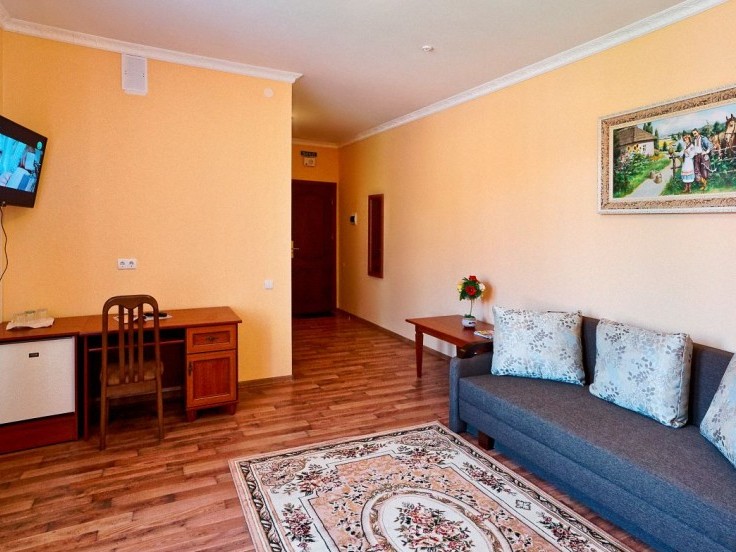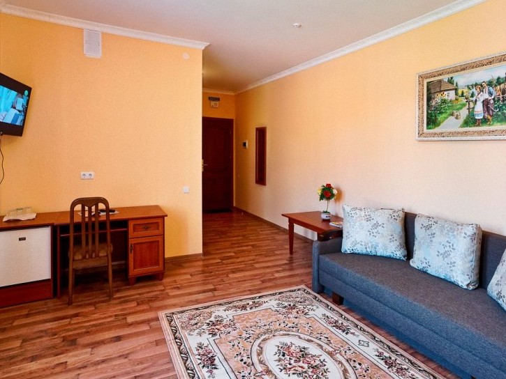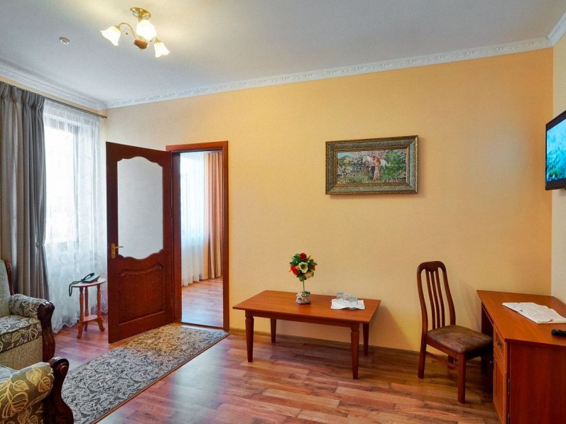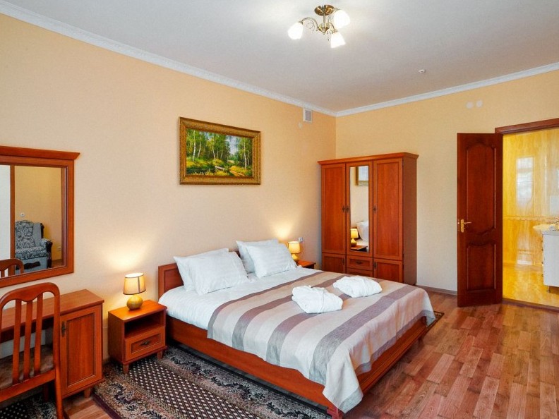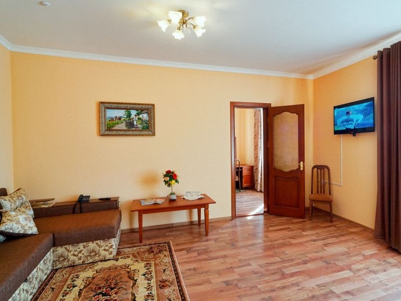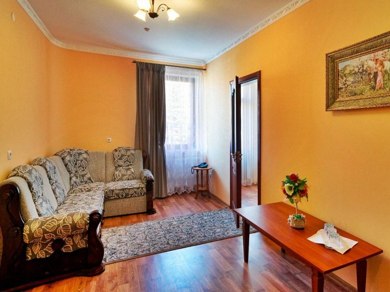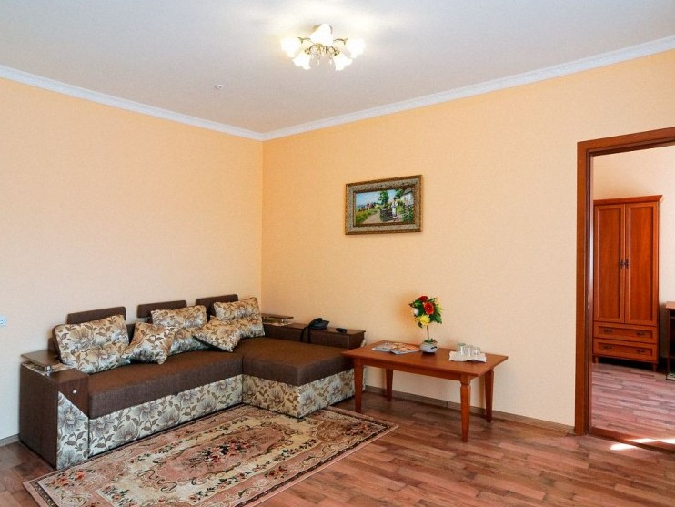 Просторный двухкомнатный номер с кухней площадью 55 кв. м имеет все, что необходимо для отдыха. В номере есть двуспальная кровать, диван, сейф, телевизор, телефон, интернет, холодильник. Ванная комната оснащена душевой кабиной, комплектом полотенец, косметическим набором, фен, халат, тапочки.