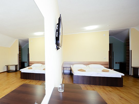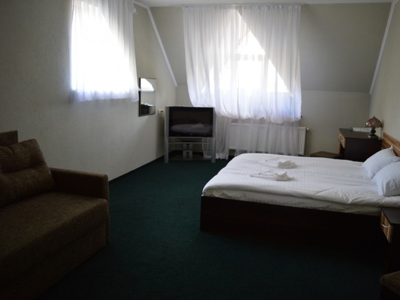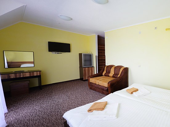 Уютный и комфортабельный номер-люкс, является 2-х и 4-х местного размещения. Спальня оборудована двуспальной кроватью, кондиционером, парфюмерным столиком с зеркалом и плазменным телевизором с кабельным телевидением.