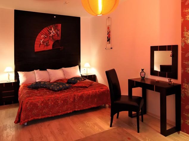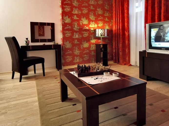 Прекрасный однокомнатный номер оформлен в китайском стиле, общая площадь которого составляет 39 кв.м., рассчитан на поселение до 4 человек. Номер оборудован двухспальной кроватью, мягким уголком, прикроватными тумбами, журнальным столиком, рабочим столом с подключением к скоростному Интернету, телевизором со спутниковым ТВ, шкафом, телефоном с прямым международным доступом, мини-баром, гардеробом. В номере также предусмотрен кондиционер и электронный замок. Санузел оснащен ванной с круглосуточной подачей холодной и горячей воды, биде, феном.