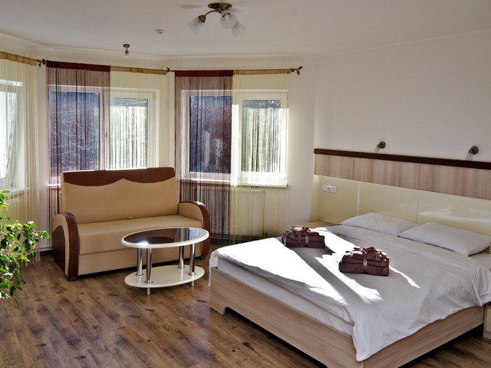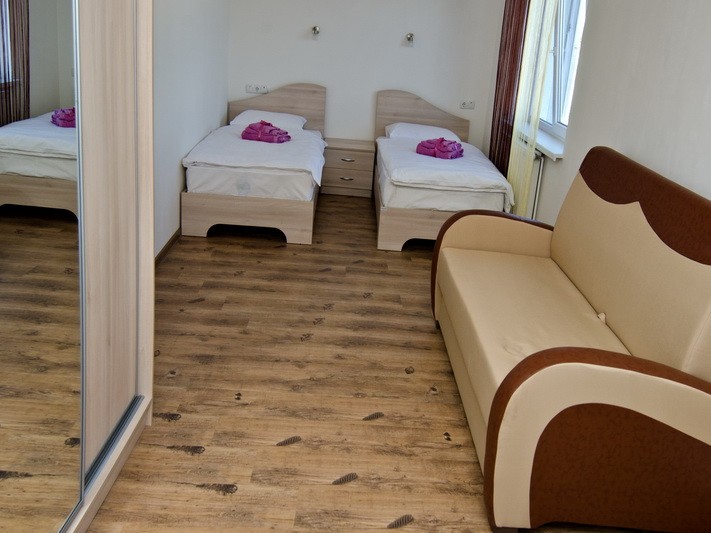 Однокімнатний номер площею 20-22 кв. м обладнаний всім необхідним для комфортного відпочинку. У номері є 3 односпальні ліжка або двоспальне і односпальне ліжка, шафа для речей, телевізор. Ванна кімната оснащена душовою кабіною, комплектом рушників.