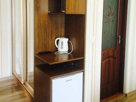 Просторий номер площею 30 кв. м оснащений всім необхідним для повноцінного відпочинку. У номері є двоспальне ліжко, телевізор, шафа, стіл, стільці, холодильник, кондиціонер, комод. Ванна кімната оснащена душовою кабіною, комплектом рушників.